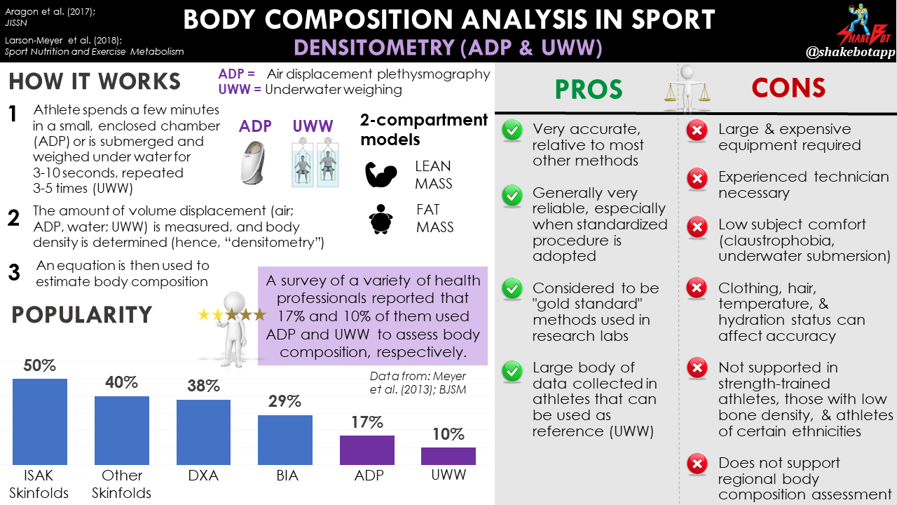 Densitometric (i.e. volumetric) body composition methods, including air displacement plethysmography (ADP) and underwater weighing (UWW) are considered to be a few of the most accurate methods for body composition assessment. However, there are several hurdles that must be overcome in order to obtain accurate and reliable results, particularly in athletes. Although highly accurate methods, they are also two-compartment models (i.e. only measure fat mass and fat-free mass) which fail to capture regional body composition. Additionally, the high equipment cost, requirement for an experienced technician to be present, high degree of athlete participation, and potential discomfort are deterrents for their use, especially in elite athletes.